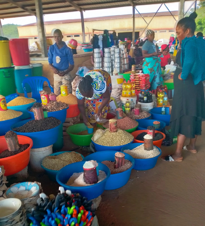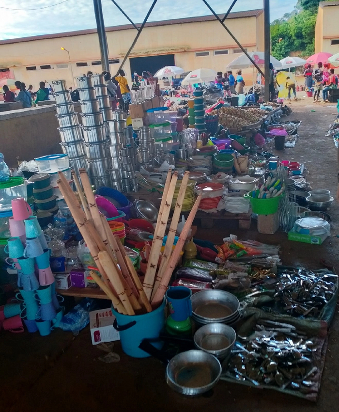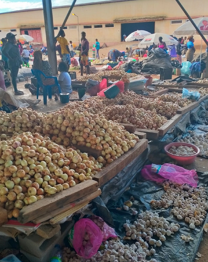 Иногда сюда приезжает машина с овощами и фруктами, торговки выкупают товар и распродают потом на рынке. Либо сами привозят товар из других городов. Кто-то продает урожай со своих плантаций. Территория достаточно большая. БОльшая площадь рынка отведена под продажу овощей. Также продают и одежду с обувью, разную бытовую мелочевку, посуду. Часть рынка крытая, стоят прилавки. Некоторые женщины торгуют, сидя под зонтами-тентами. Здесь нет весов, все отмеряется кружками, жестяными банками, ведрами (иногда полными, иногда нет), ящиками, "на глаз". Неполное ведро выглядит так: примерно на середине ведра начинают укладывать овощи, плотно прижимая друг к другу, чтобы этот слой держался, далее накладывают сверху. Я напишу в рублях, что и сколько в среднем стоит.