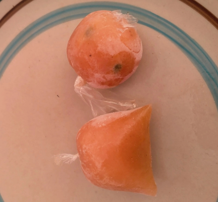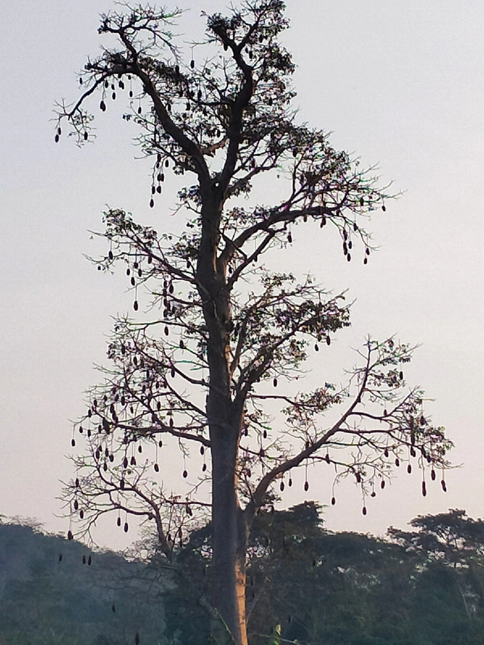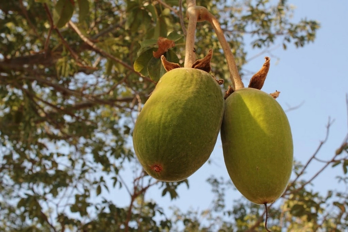 Молодой баобаб и баобаб уже с плодами. Плоды называются mucua. Зелёные со временем высыхают и темнеют. Из мукуа здесь делают фруктовый лед. Высохшую плоть варят, процеживают, добавляют в сок сахар и замораживают. Иногда такой десерт делает на продажу наша знакомая, мороженое на фотографии как раз ее. Один шарик льда стоит 1 руб 20 коп. Кто-то формирует лёд продолговатым, иногда добавляют маракуйю. Мороженое немного вяжет. Когда-то в социальных сетях продавали мешок мукуа за 1060 руб. Скорлупа твердая, раскрывают, стуча по ней молотком или камнем. Здесь просто так плоды баобаба не едят.