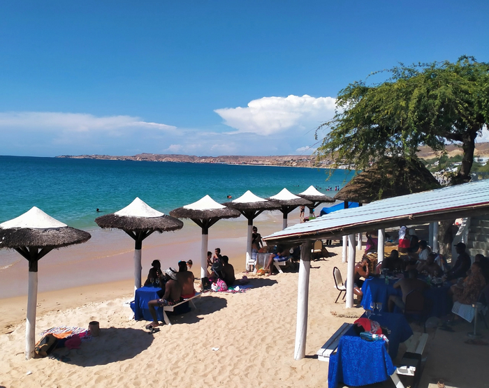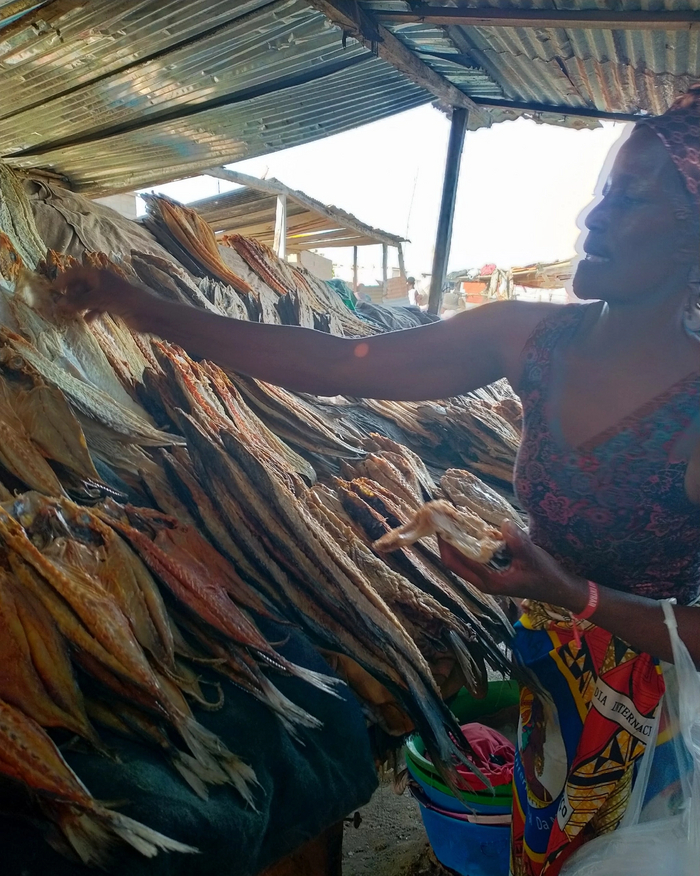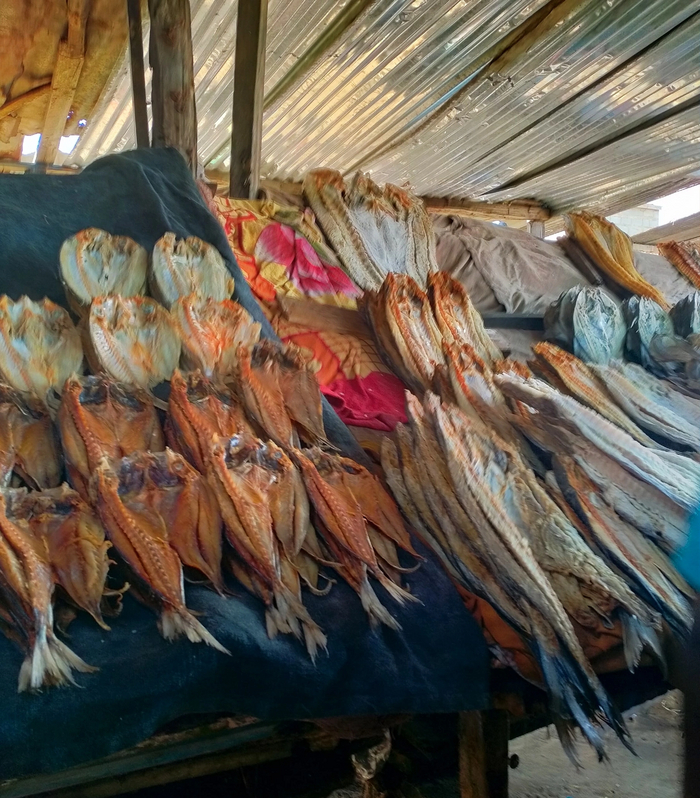Утром, прежде чем покинуть Бенгелу, мы заехали купить вяленую рыбу. Только мы начали поворачивать с основной дороги к домам, машину сразу окружили дети, предлагая показать, где можно купить рыбу. Ехали по узкой разбитой дороге между домами, дети бежали за нами, не желая терять клиентов. На улице стоял сильный тошнотворный запах. Мальчишки повели нас по рынку к определенным прилавкам. На рынке было очень людно, тесно, дышали в затылок. Мы шли цепочкой, прижавшись друг к другу. Здесь легко потеряться, толпа просто унесет. Продают разную вяленую рыбу, каких только видов нет... Продают сразу по несколько штук. Например, рыба-сабля - 6 штук 2000 кванз. 3 тушки трески - 20 000 кванз. Мы с мужем купили 5 видов рыбы: атлантическую треску (очень крупная рыба), рыбу-саблю, горбыля, морского окуня. Название пятой рыбы мы вспомнить не смогли, по фотографиям похожа на кефаль. За рыбу мы отдали 37000 кванз, 2 рыбины нам еще доложили бесплатно. Все пакеты до машины донесли мальчишки, попросили у нас деньги. Рынок расположен на берегу океана, недалеко от берега стояли небольшие рыболовные судна. Рыбу чистят в окрестностях рынка, вот что за запах стоял на той улице. Это гниют и пахнут рыбные очистки. Но вяленую рыбу продавцы покупают на Baía Farta (пер. "Залив изобилия") у местных рыбаков, перепродают на рынке. Baía Farta - один из округов и город в провинции Бенгела.