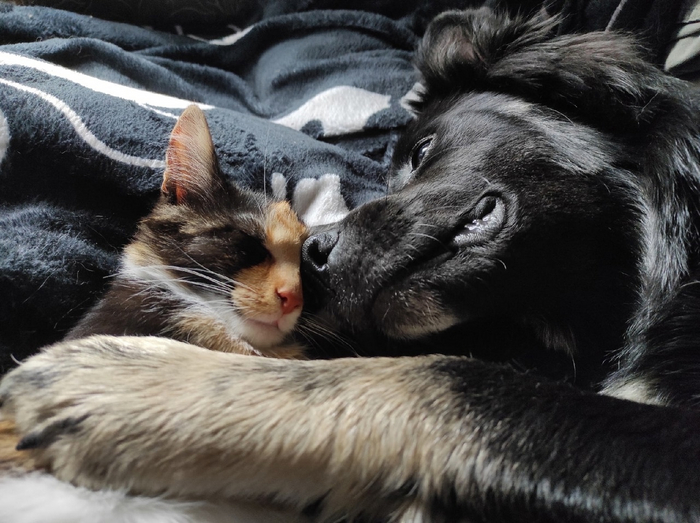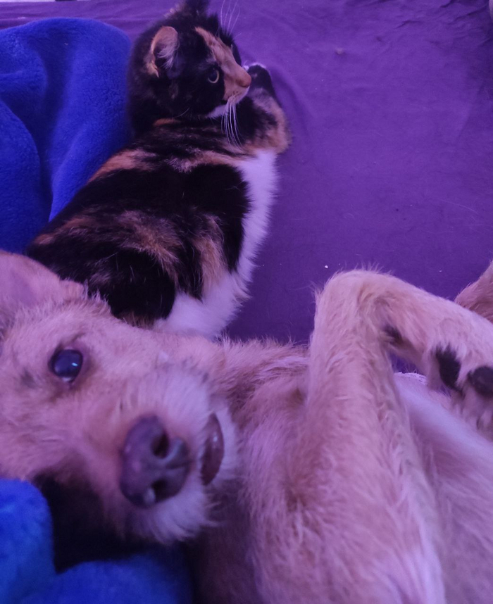 Мелкий был намыт, обработан и накормлен из шприца, Зевс руководил каждым шагом, обеспокоенно нализывая его каждые пять минут, а я уже обрывала телефон знакомой волонтерше Любе. Тем же вечером котенок был "выменян" на другого, потому что Любе надо было снизить нагрузку из количества подопечных, чтобы взяться за реабилитацию найденыша. Мы очень вовремя его подобрали, потому что он был на грани комы, попутно у него обнаружилось отсутствие сустава в задней лапке. Люба вбухала бешеное количество денег, чтобы его оживить, и в итоге оставила себе, дав имя Бемби. А нам досталась очаровательная пипетка-трехцветка, которую Зевс моментально удочерил. Уж насколько сильная у меня всегда была связь с этим песелем, но его любовь к новой кошечке перебила даже его любовь ко мне. И Кнопка ответила взаимностью.