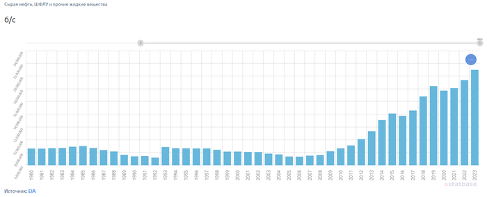 Возможно США еще расчищает рынок для своей нефти при агрессии на Иран, ведь у них добыча нефти выросла в несколько раз (график ниже), а продавать уже толком некуда, да еще и цена падает. Убрали Венесуэлу, Сирию с рынка нефти (графики ниже). Сейчас вот хотят убрать Иран, возможно они и хотели, чтобы Иран закрыл Ормузский пролив. Ограничить стоимость нефти и бензина внутри США Трамп сможет своей директивой (чтобы народ не бузил) и не плохо так заработают на продаже своей нефти на экспорт. А вот Европа, Китай и Индия, главные конкуренты США, сильно пострадает от увеличения стоимости нефти