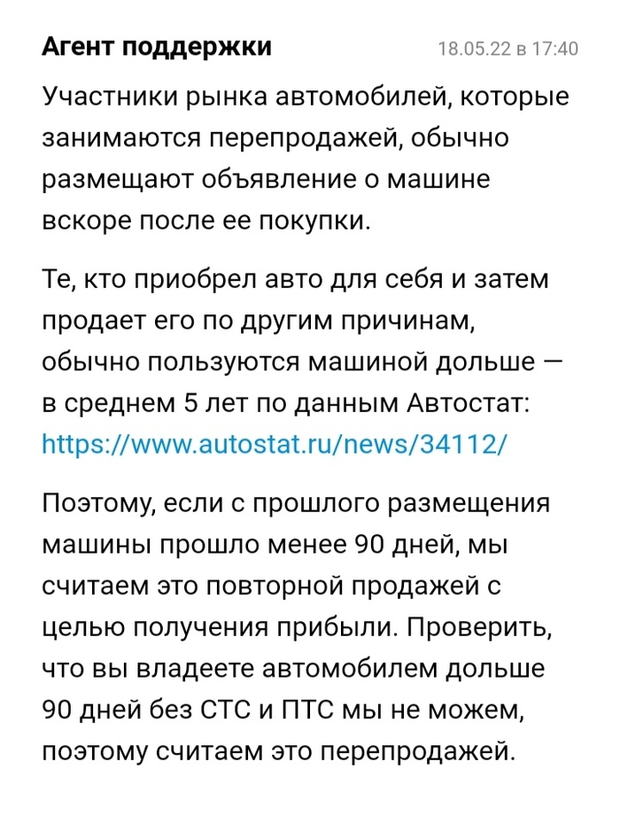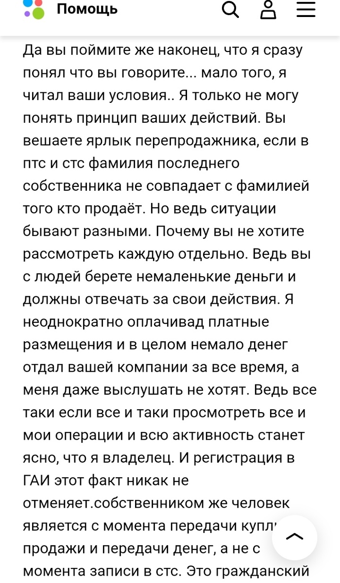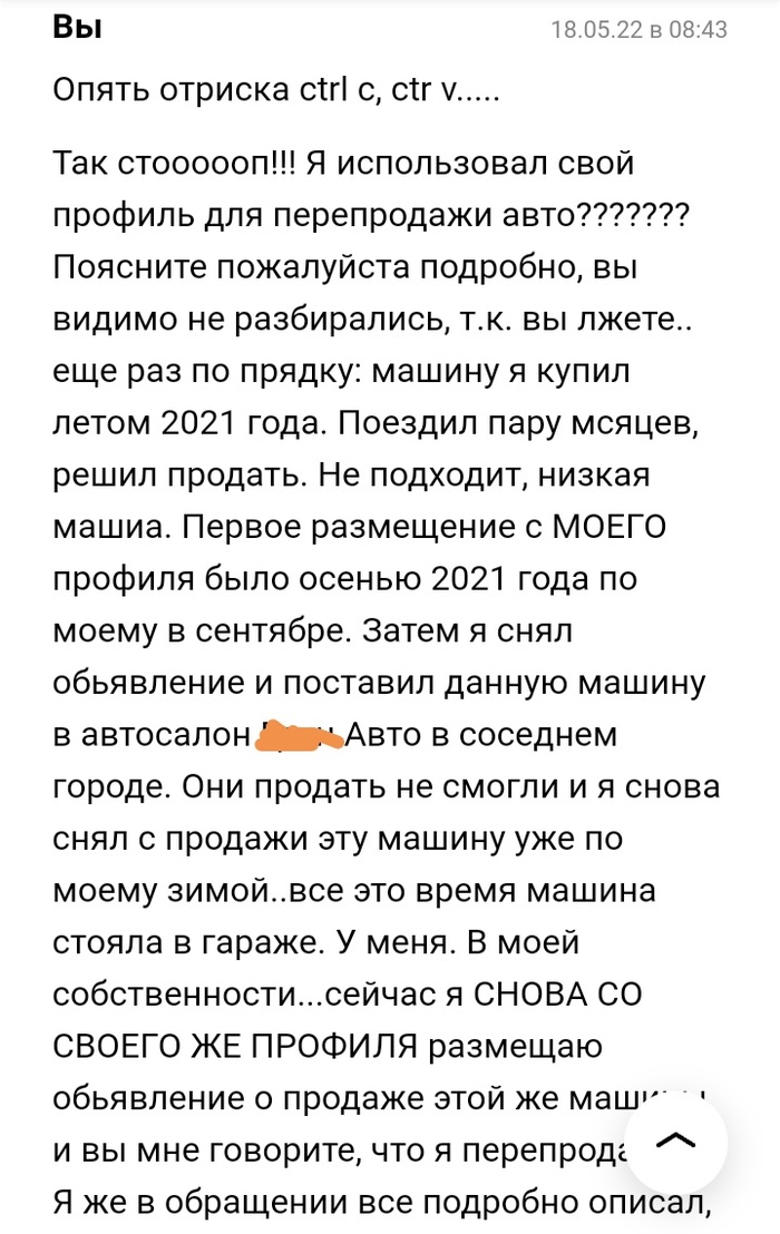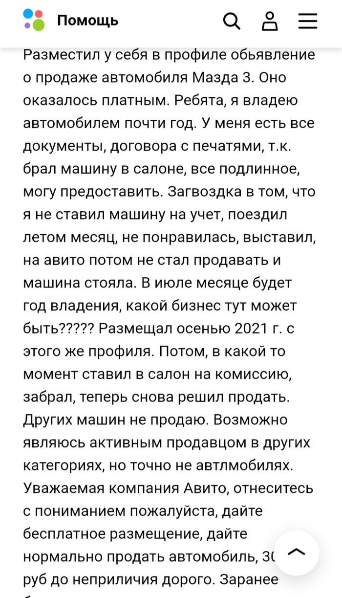 Добрый день, хочу положить в копилку сервиса Авито свою каплю негатива. Предупреждаю что длинно пост, не все осилят прочитать до конца) ... В августе 2021 приобрёл б/у автомобиль Мазда 3. Цель покупки была вынужденная, т.к. до этого продал свой автомобиль Форд Экоспорт, хотел приобрести Тигуан, который меня не дождался и был успешно продан кому то другому. И осталсяя с деньгами, которые в тот момент из-за кризиса, пандемии и чего то ещё обесценивались с каждым днем, т.к.цены на автомобили росли как на дрожжах. А на рынке хороших вариантов практически не было. В итоге вместо Тигуана или похожего кроссовера мне необходимо было взять хоть что-то, чтобы сохранить деньги, за которые, как позже выяснилось, если бы ещё тянул, то мог купить только Ладу Гранту свежую. В итоге знакомый, работающий в автосалоне посоветовал купить у них Мазду 2014 года, которая была в отличном состоянии, и, как он объяснил, это ликвидный автомобиль, который всегда можно продать за свои деньги. Купил. Поездив на ней около недели, понял что данный автомобиль не подходит под мои цели. К машине самой претензий нет, но мне нужен клиренс побольше и более просторное пространство сзади. Через месяц после покупки попытался продать на Авито , но цену выставил по верхней границе рынка (не самый верх), но машину никто не купил. Сразу скажу, цену выставил не из-за жадности, а с учётом колебаний рынка в условиях неопределённости решил перестраховаться. Логика такая, что если не купят, то фиг с ним, колеса есть, ничего не теряю, а если купят то и у меня есть запас по деньгам и время на поиск кроссовера. Так же, человек который у меня купит машину, не пожалеет о покупке из за её состояния. Объявление подавал через Авито, тогда его сделали платным, т.к. до этого машина продавалась в автосалоне и тоже ранее была на Авито. В тот момент спорить с платным размещением не стал, т.к.было видно, что я только купил машину и тут же продаю. Но написал обращение на всякий случай в Авито, где мне любезно отказали в бесплатном размещении, на том и разошлись. Машину не продал, поставил в гараж, а сам пользовался машиной жены. Важный момент, что Мазду я на себя не регистрировал, оставил все договора, вписал себя в птс и так планировал продать. Юридически машина моя с момента подписания ДКП и передачи денег, и, как уже сказал имеется запись в ПТС. Предыдущего собственника я тоже никак не подставил, т.к. он анулировал регистрацию через 10 дней после продажи. Получается машина на учёте не стоит, ни налог ни штрафы предыдущему владельцу не идут. Что касается меня, то если машину не эксплуатировать и поставить в гараж, то я ничего не нарушаю и фактически являюсь владельцем ТС (консультировался). И вот недавно я решил снова выложить объявление о продаже машины, где авито мне выставляет счёт с пояснением, что я занимаюсь перепродажей, получая прибыль. Согласно правил авито, бесплатное размещение возможно только в случае владения машиной более 90 дней и при отсутствии активности профиля в данной категории. Отлично, полностью подхожу под эти правила. Активности нет, т.к. последняя продажа машины была более года назад (это предыдущий Форд Экоспорт), а то что владею больше 90 дней, можно понять по размещениям, т.к. эту же машину я продавал с этого же профиля почти год назад.. Пишу обращение, в котором объясняю суть, на что мне отвечают, что маш