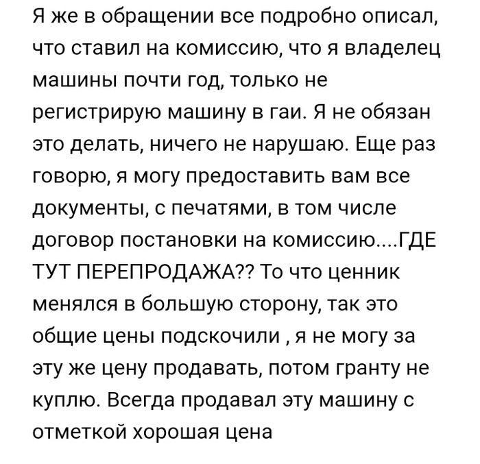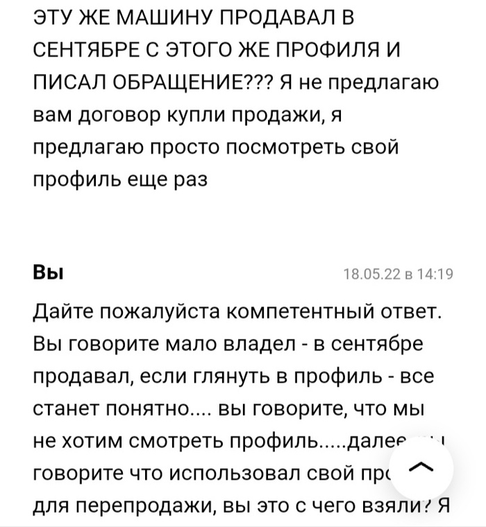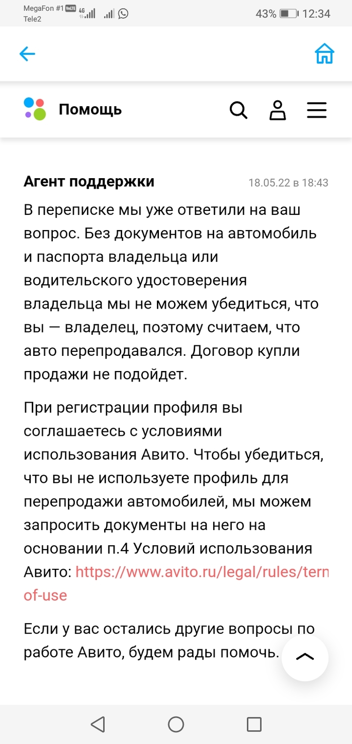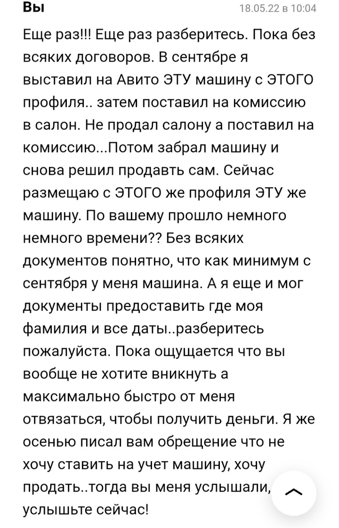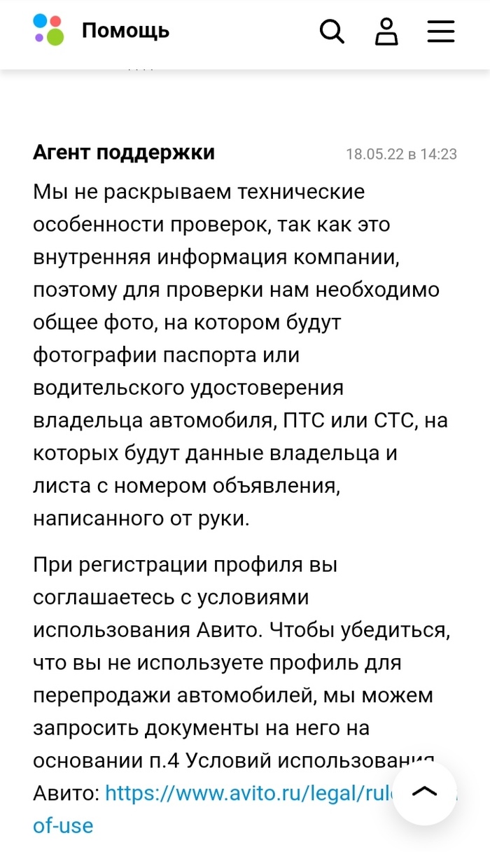 Добрый день, хочу положить в копилку сервиса Авито свою каплю негатива. Предупреждаю что длинно пост, не все осилят прочитать до конца) ... В августе 2021 приобрёл б/у автомобиль Мазда 3. Цель покупки была вынужденная, т.к. до этого продал свой автомобиль Форд Экоспорт, хотел приобрести Тигуан, который меня не дождался и был успешно продан кому то другому. И осталсяя с деньгами, которые в тот момент из-за кризиса, пандемии и чего то ещё обесценивались с каждым днем, т.к.цены на автомобили росли как на дрожжах. А на рынке хороших вариантов практически не было. В итоге вместо Тигуана или похожего кроссовера мне необходимо было взять хоть что-то, чтобы сохранить деньги, за которые, как позже выяснилось, если бы ещё тянул, то мог купить только Ладу Гранту свежую. В итоге знакомый, работающий в автосалоне посоветовал купить у них Мазду 2014 года, которая была в отличном состоянии, и, как он объяснил, это ликвидный автомобиль, который всегда можно продать за свои деньги. Купил. Поездив на ней около недели, понял что данный автомобиль не подходит под мои цели. К машине самой претензий нет, но мне нужен клиренс побольше и более просторное пространство сзади. Через месяц после покупки попытался продать на Авито , но цену выставил по верхней границе рынка (не самый верх), но машину никто не купил. Сразу скажу, цену выставил не из-за жадности, а с учётом колебаний рынка в условиях неопределённости решил перестраховаться. Логика такая, что если не купят, то фиг с ним, колеса есть, ничего не теряю, а если купят то и у меня есть запас по деньгам и время на поиск кроссовера. Так же, человек который у меня купит машину, не пожалеет о покупке из за её состояния. Объявление подавал через Авито, тогда его сделали платным, т.к. до этого машина продавалась в автосалоне и тоже ранее была на Авито. В тот момент спорить с платным размещением не стал, т.к.было видно, что я только купил машину и тут же продаю. Но написал обращение на всякий случай в Авито, где мне любезно отказали в бесплатном размещении, на том и разошлись. Машину не продал, поставил в гараж, а сам пользовался машиной жены. Важный момент, что Мазду я на себя не регистрировал, оставил все договора, вписал себя в птс и так планировал продать. Юридически машина моя с момента подписания ДКП и передачи денег, и, как уже сказал имеется запись в ПТС. Предыдущего собственника я тоже никак не подставил, т.к. он анулировал регистрацию через 10 дней после продажи. Получается машина на учёте не стоит, ни налог ни штрафы предыдущему владельцу не идут. Что касается меня, то если машину не эксплуатировать и поставить в гараж, то я ничего не нарушаю и фактически являюсь владельцем ТС (консультировался). И вот недавно я решил снова выложить объявление о продаже машины, где авито мне выставляет счёт с пояснением, что я занимаюсь перепродажей, получая прибыль. Согласно правил авито, бесплатное размещение возможно только в случае владения машиной более 90 дней и при отсутствии активности профиля в данной категории. Отлично, полностью подхожу под эти правила. Активности нет, т.к. последняя продажа машины была более года назад (это предыдущий Форд Экоспорт), а то что владею больше 90 дней, можно понять по размещениям, т.к. эту же машину я продавал с этого же профиля почти год назад.. Пишу обращение, в котором объясняю суть, на что мне отвечают, что маш