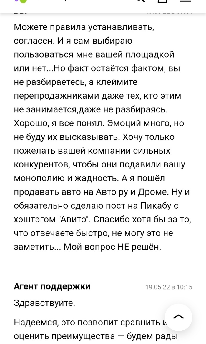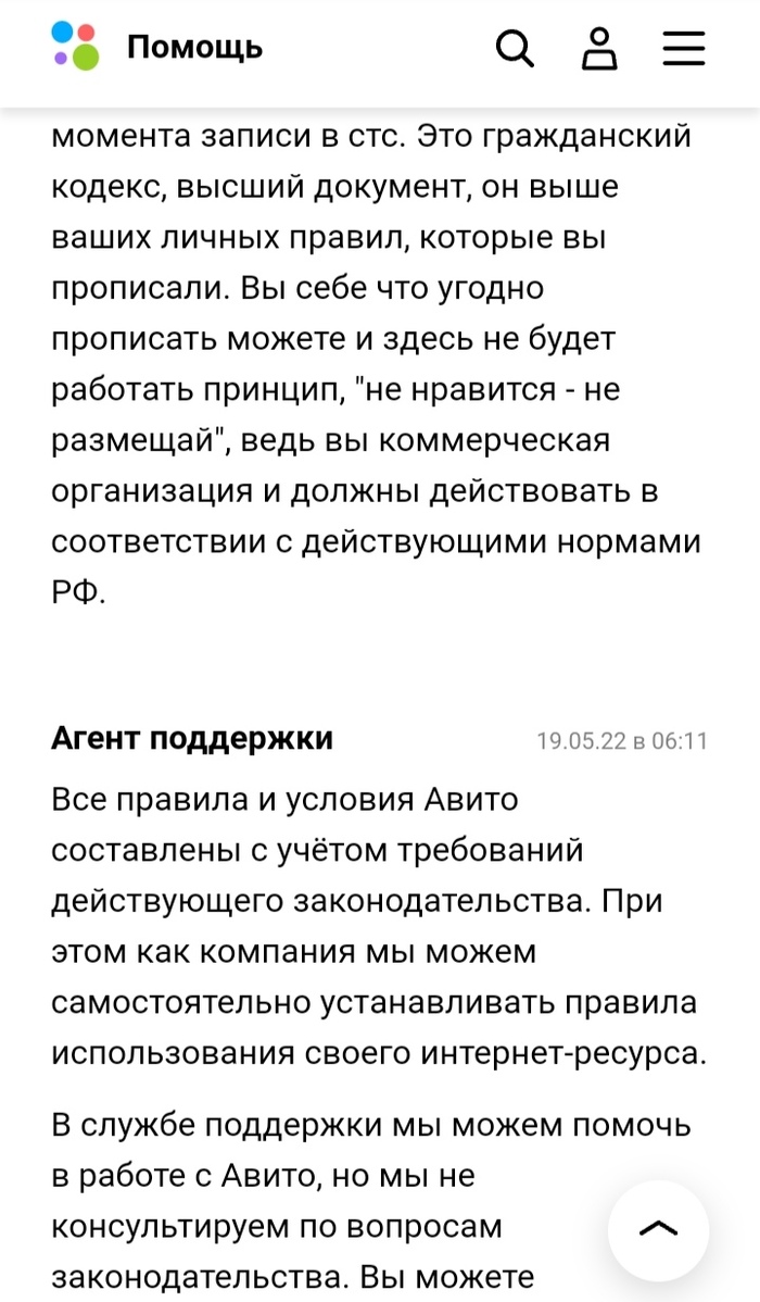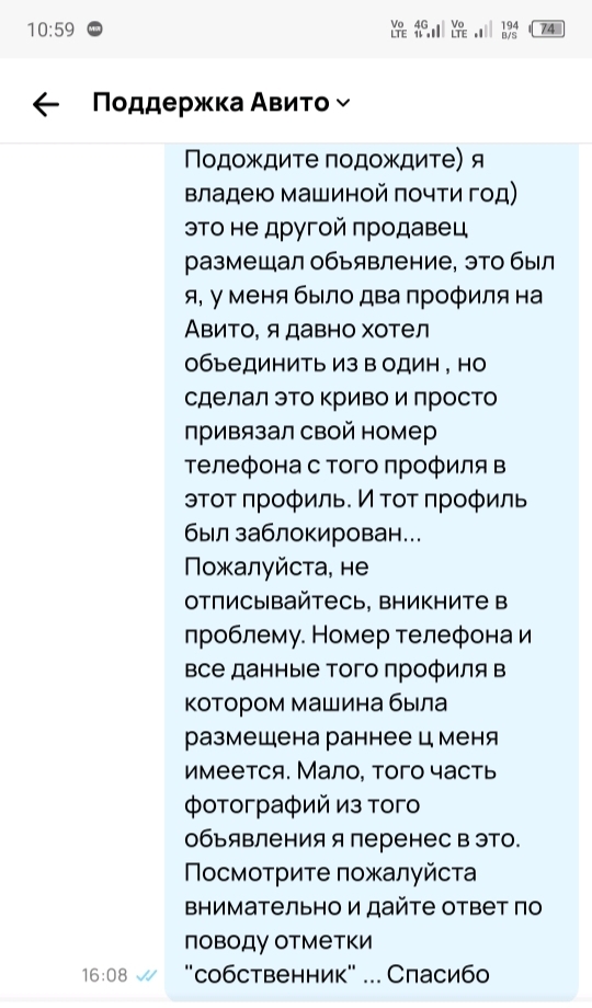 Далее прикладываю скрины переписки. Бодался я с ними знатно и долго талдычил одно и то же, тупо скопированные шаблоны получал в ответ, которые они редко разбавляли бесполезными фразами... Из за этого получились длинные диалоги, в которых много воды, за что прошу прощения. Мало того, это не вся переписка, очень много вырезал, чтоб совсем ленту не затопить, поэтому если увидите несостыковки, скорее всего их за урезания текста, но суть понятна и так...... Так же сори за мою истерику в диалоге с Авито, реально подгорало от их ответов..... Если, по вашему в этой ситуации неправ я и Авито грамотно мне пыталось это объяснить, готов принять конструктивную критику.