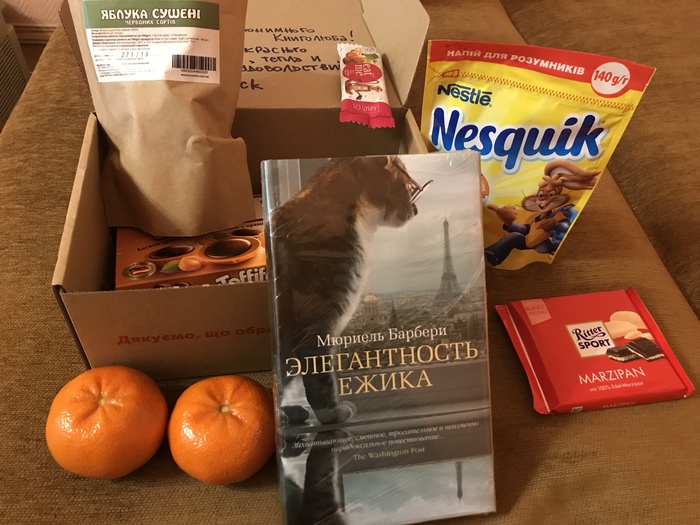У меня не только книга, а еще и все для создания правильной атмосферы: какао, конфеты, шоколад, сушеные яблочки и мандаринки. С моей стороны осталось только дополнить все пледом и котом