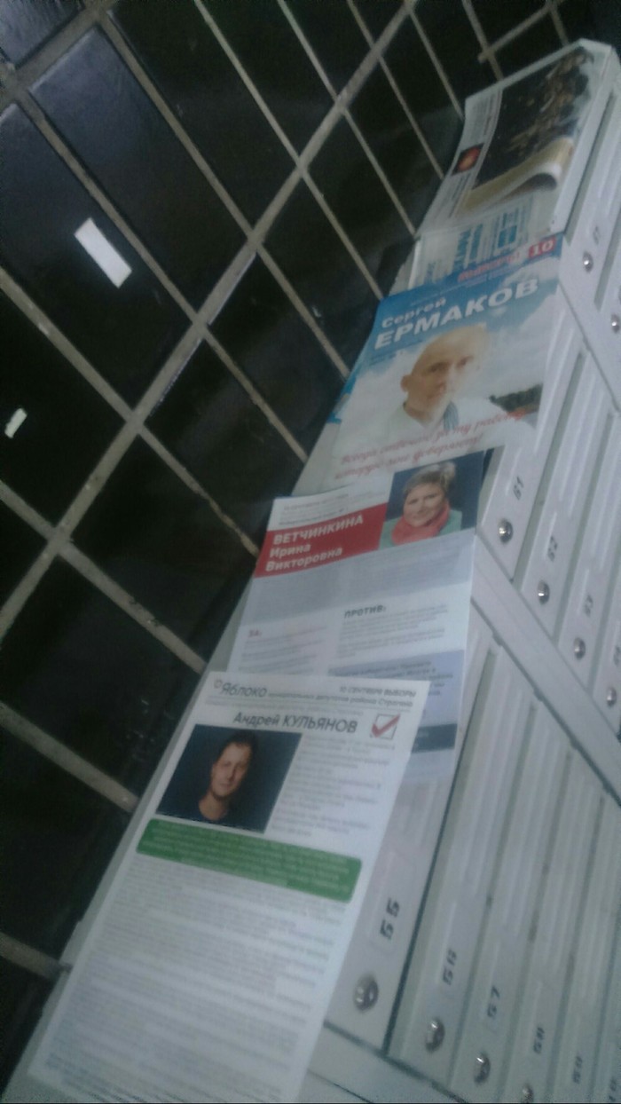 Листовки в подъезде, информационные щиты и смс рассылка. И это не все, около метро установлены предвыборные роллапы кандидатов.