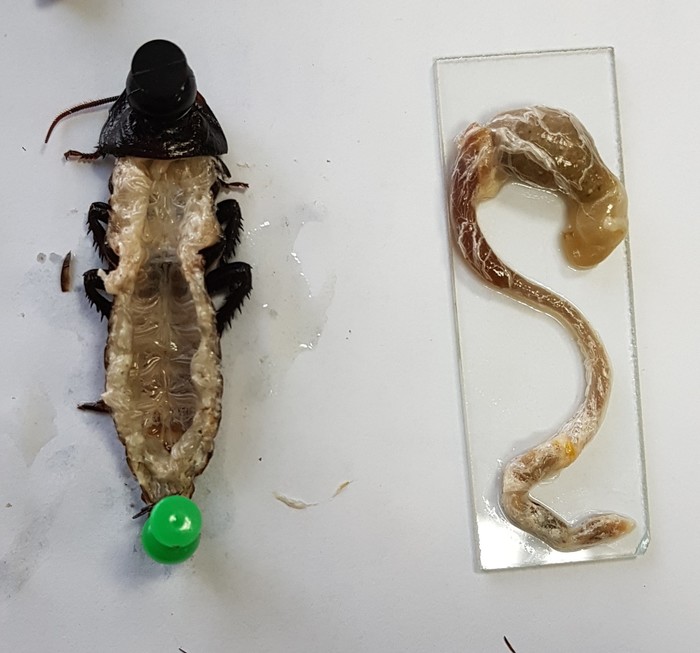 И вот, получаем вскрытого таракана и его нервную, пищеварительную и дыхательную системы. (Смотреть сверху вниз). Таракан мой, фото мои, все мое.