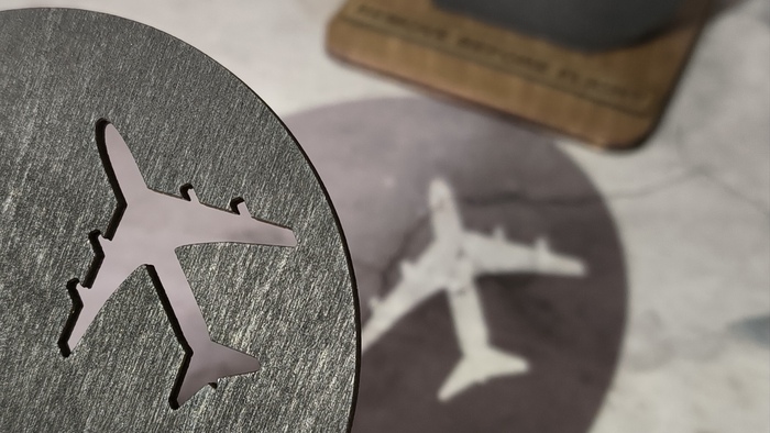 Два слоя фанеры, верхний окрашен в чёрный бархатный цвет. Внутри вставка из двухцветного пластика. Получилось занятно.