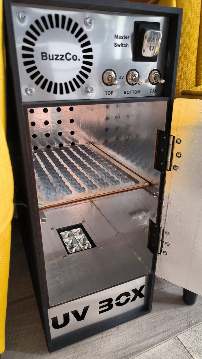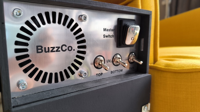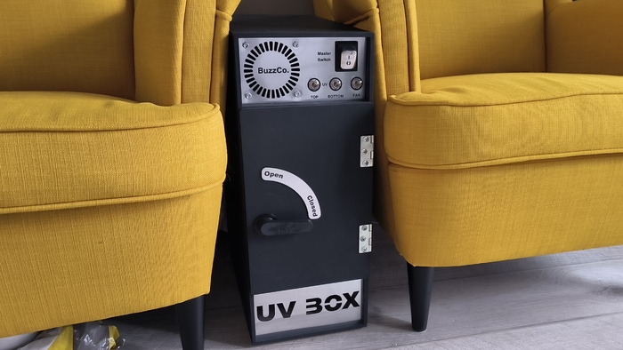 Корпус двойной. Рабочая камера гораздо меньше корпуса. Между ними установлены сами лампы, и обдув для охлаждения. Буквы в нижней панели вырезаны, для выхода воздуха. Ну и естественно все элементы имеют отдельные выключатели. Очень я люблю всякие тумблеры… и выключатели… спать не могу. Проф деформация, что поделать…