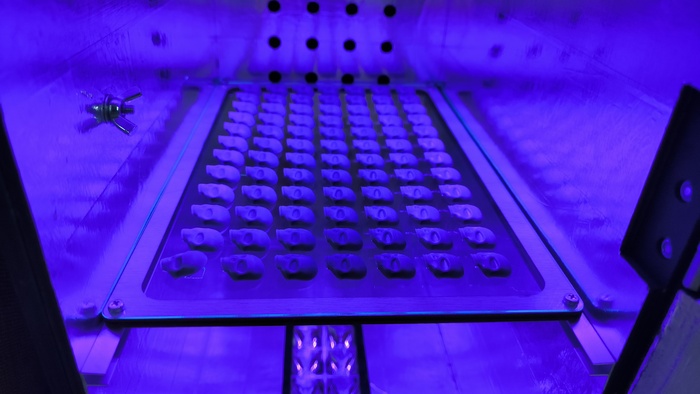 После печати на фотополимерном принтере модель необходимо отмыть от остатков смолы, и затем «запечь» в ультрафиолетовой камере, чтобы верхние слои набрали прочность.