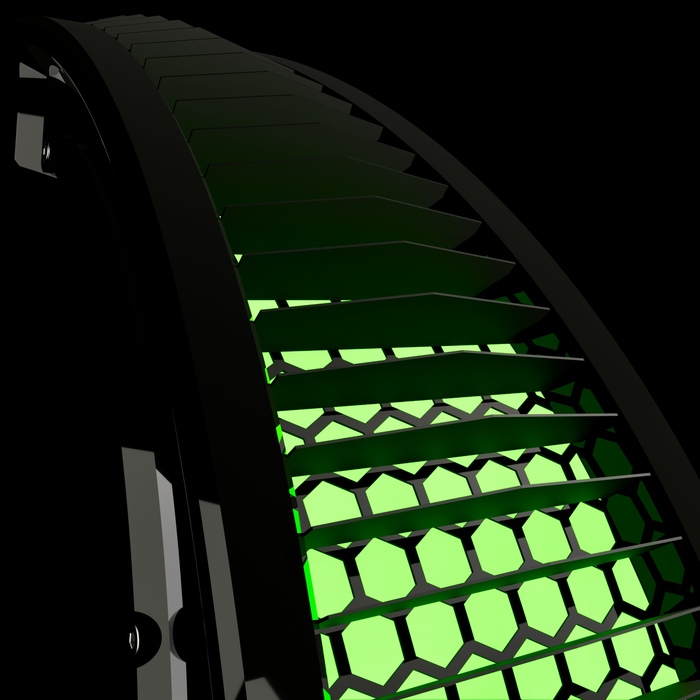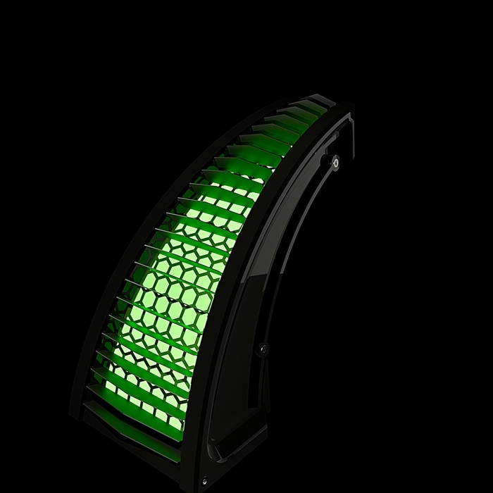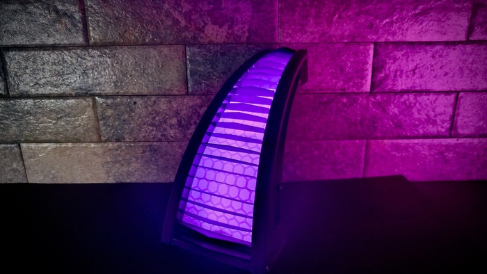 Внутри светодиодная RGB лента. Собирается на винтах М3. Ламели и экран хотел делать из дизайнерского картона, на лазере. Изготовил, примерил, и выбросил. Принтер даёт больше свободы. Формы, толщина материала, светопроницаемость материала — всё это лучше поддаётся коррекции именно при печати на принтере.