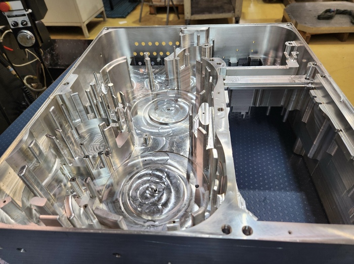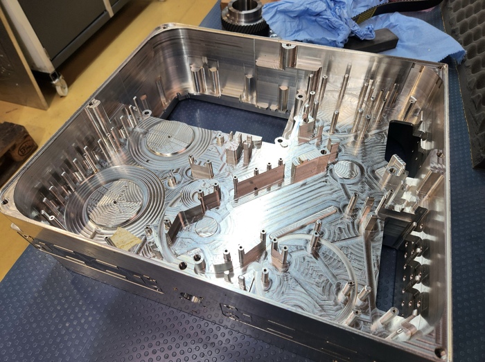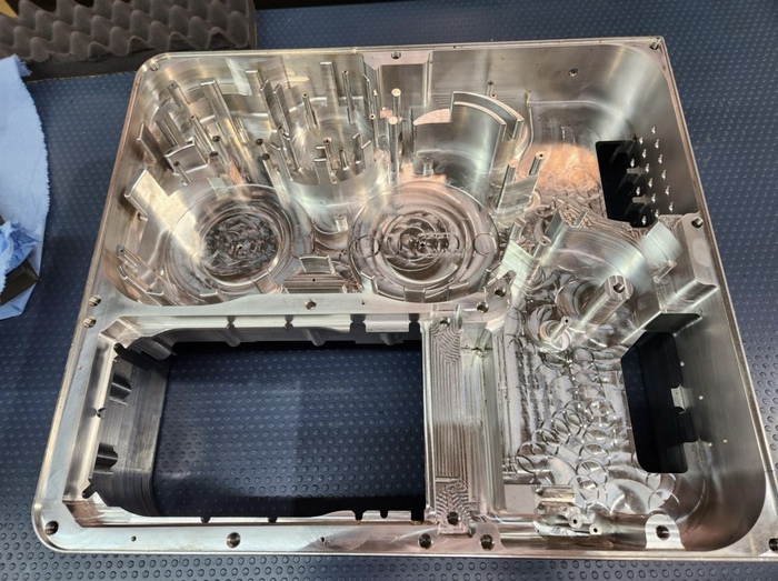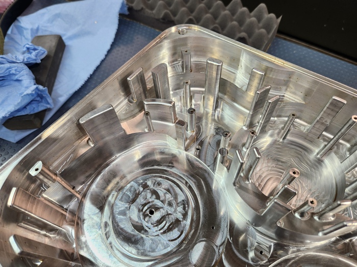 Размер работы 480 мм x 425 мм x 160 мм. Все запрограммировано на Mastercam. Так много неудобных деталей. Мне потребовалось около 3 недель, чтобы запрограммировать. Некоторые бортики были диаметром всего 6 мм, но глубиной 80 мм. Нехватка места в некоторых областях заставила меня использовать длинную серию 6 мм концевой фрезы с 6 мм хвостовиком на 90 мм. Какой кошмар.