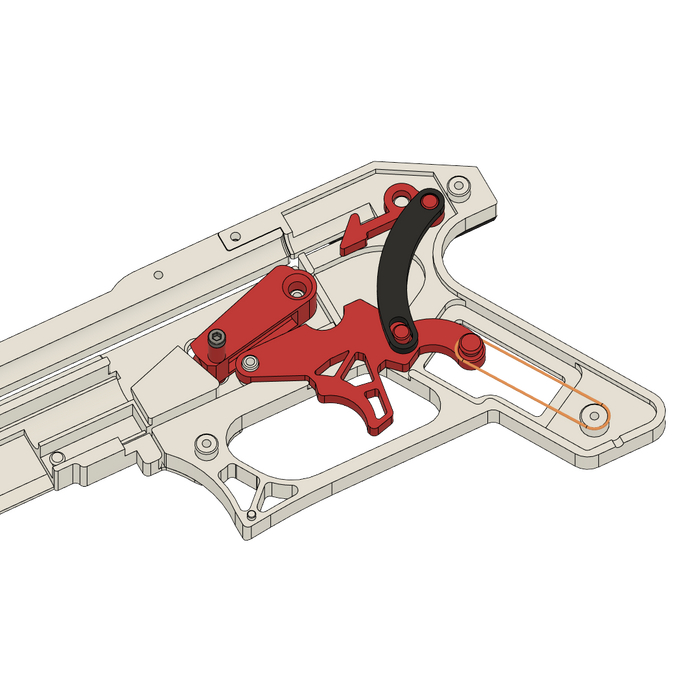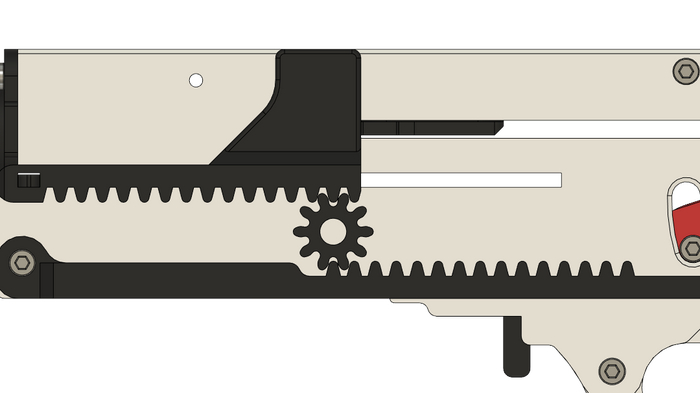 Так появилась система реек. При движении затвора, он увлекает шестерню. Она цепляется за нижнюю рейку, и вращаясь — двигает верхнюю рейку, которая и взводит толкатель. В конце хода он встаёт на защёлку.