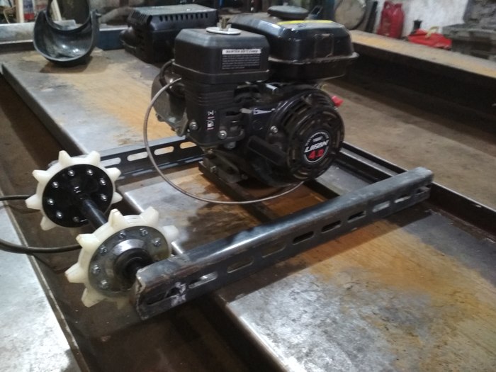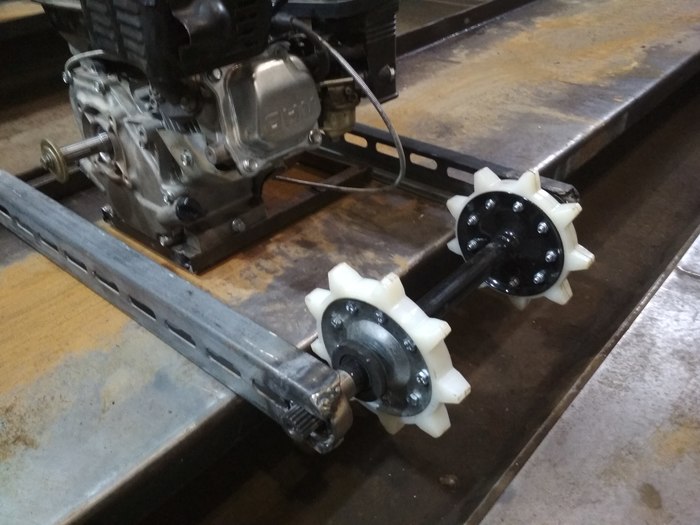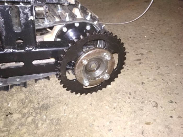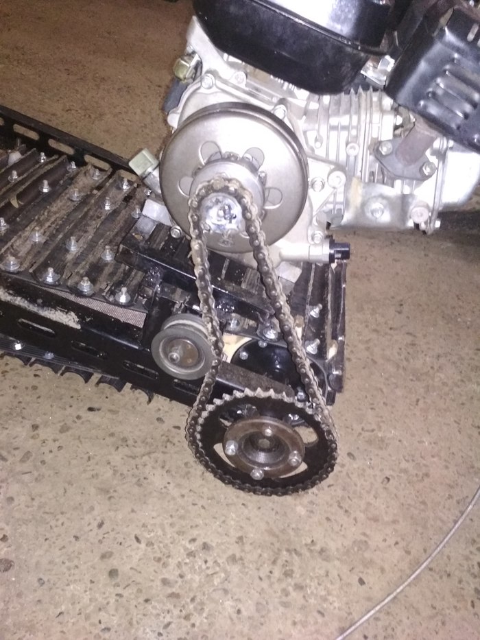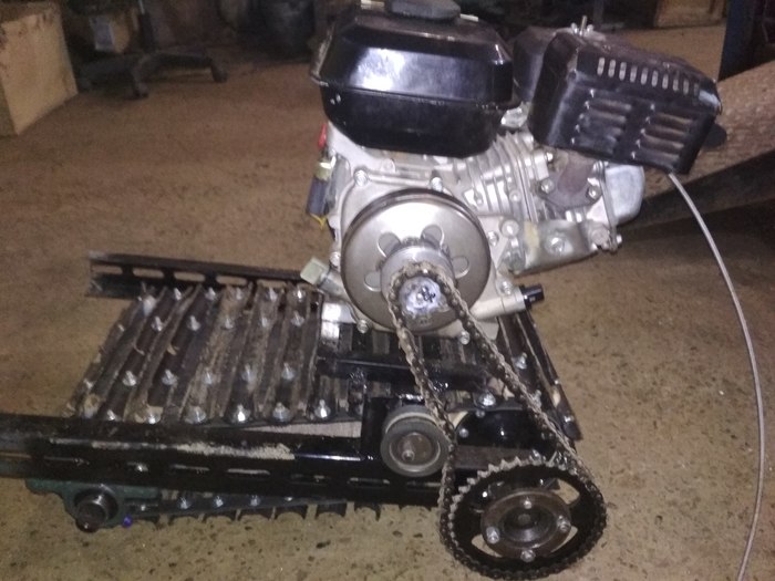 Решил к новому году ребенку сделать снегоход .идея пришла после того как мне подарили двигатель от мотоблока.Двигатель на тот момент был без компрессии и не заводился.в свободное время я его разобрал. заменил кольца и прокладку .И он ожил. Были куплены : два вала снегохода буран 2100 р два корпуса подшипников 600 .лента транспортерная 2м б/у 200 р .болты и гайки м 6. трубы валялись в гараже остатки .цепи звезды восход.600 р сцепление центробежное сделано из заднего вариатора скутера