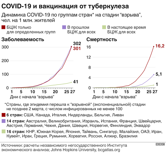 Приведенные Институтом расчеты показали: в шести "невакцинированных" государствах эпидемия Covid-19 разрастается значительно быстрее, чем в странах, где БЦЖ в обязательном порядке ставят до сих пор. Как по общему числу инфицированных на 1 млн населения, так и по количеству погибших.