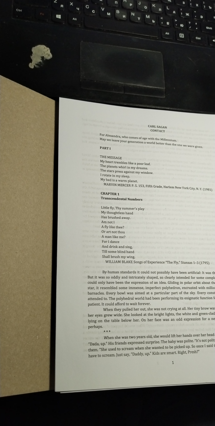 Слушайте, так раздражают сайты знакомств и анкеты. Вот сижу и представляю, написал человек, люблю то сё, и реально прям любит пешие прогулки? Каждый день прям ходит-бродит-пешит... Такие все активные живые, и мега-интересные?.. Я может тоже люблю пешие прогулки, а завтра вот панама накрыла и хочу полежать под misfits. И вообще говорить не хочу слова. Не верю, что я одна такая среди супер активных, целеустремлённых, жизнерадостных приматов. А я тоже целеустремлённая ☝🏼Хотела книгу "Контакт" Карла Сагана. Получила! Распечатала наконец. Принтер починила и распечатала. Надоело искать бумажную. Нет её на просторах инета. Будет книга моей личной "типографии". Переплёт ещё делаю.