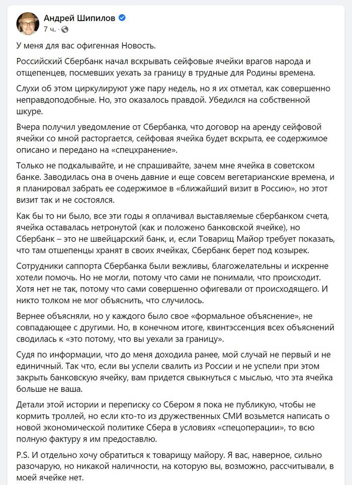 Журналист и писатель Андрей Шипилов сообщил, что Сбер начал вскрывать банковские ячейки «врагов народа» и прочих «неблагонадёжных» граждан, уехавших из РФ.
