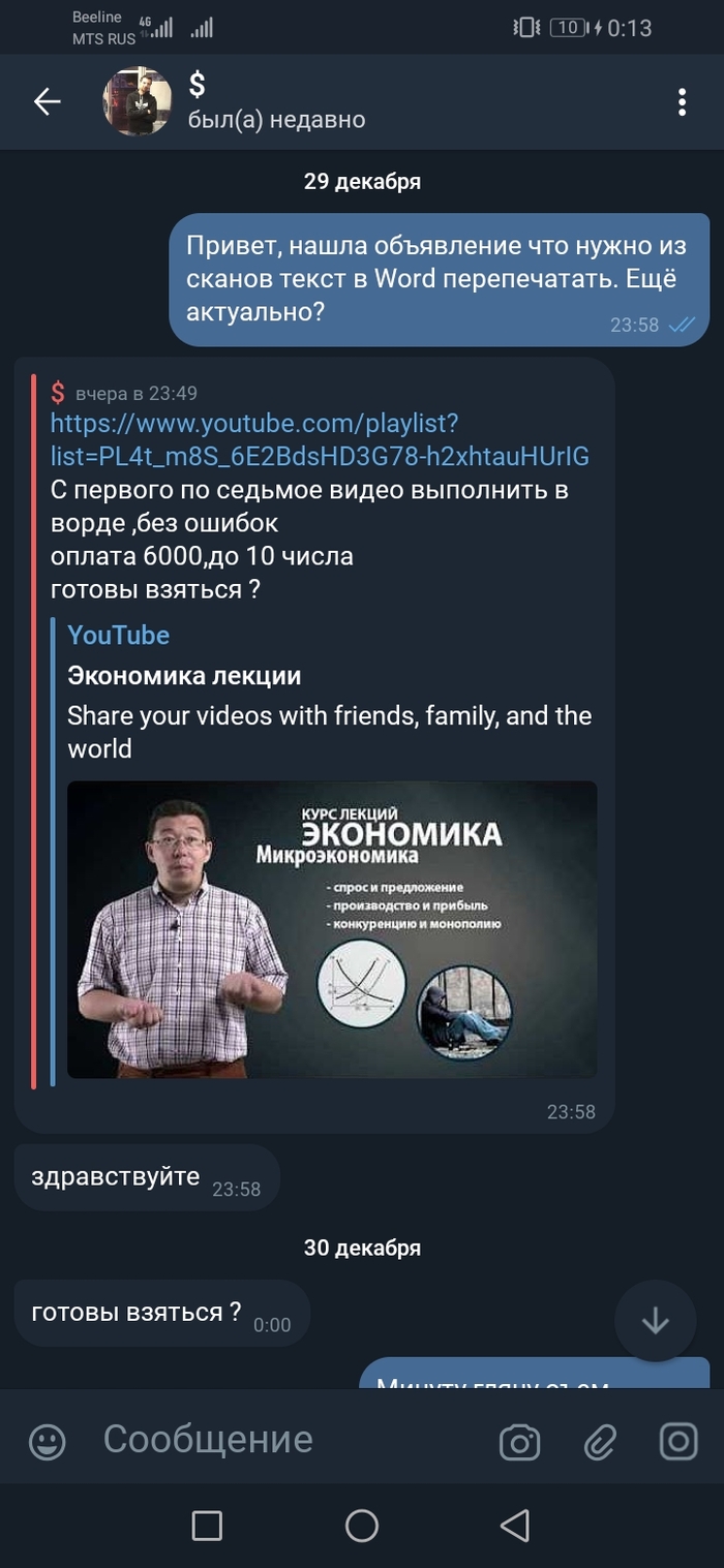 Скидывают ссылку на лекции их там 50шт, по 2-4 минуты, срок до 10 числа, всего 56 видео. Даю согласие ну и естественно интересуюсь гарантии и авансом