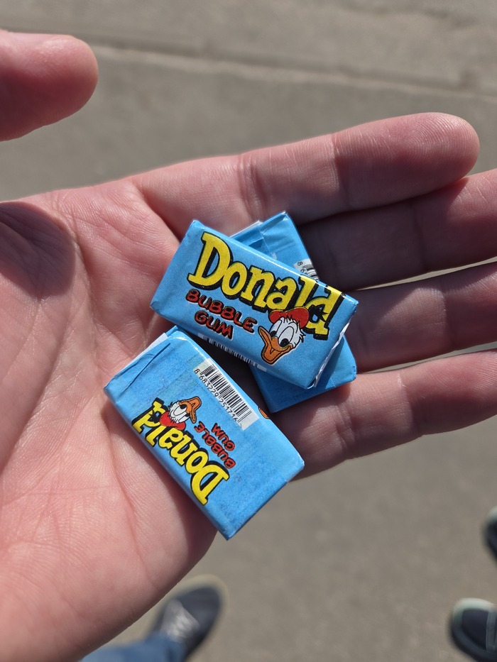 Оказывается у нас на рынке рядом с домом продаются вот такие жвачки. Те самые "Дональды", у которых внутри вкладыши "Мультики", на них мы в школе играли. Тогда это была огромная ценность. Всякие "Турбо", "Лав из" - это было позже, сначала были "Дональды". Такие жвачки тогда можно было либо привезти из-за границы, либо купить у поляков или циганей, по рублю штука. Эти сегодняшние на вкус точно такие как были, и пузыри из них надуваются как надо.