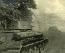 На следующие день, развивая наступление, мы "перерезали" шоссе Киев-Житомир. Вот здесь я получил настоящее боевое крещение. Утро. Сплошной туман. Атакуем село Горенка (Горянка) и выходим на его западную окраину. Заряжающий кричит: "Два танка справа!". Туман такой, что в прицел ничего не видно. Надо сблизиться. Впереди, в метрах 100, сарай. Принимаю решение и даю команду: "Механик, заводи и до сарая на полной скорости вперед!"