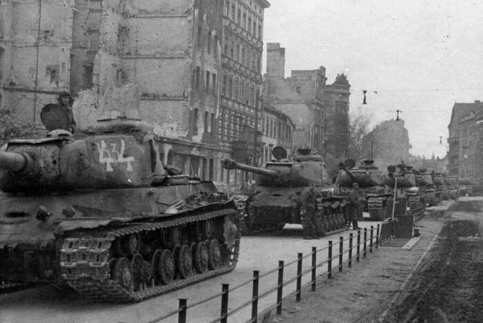Танки ИС-2 104-го отдельного гвардейского тяжелого танкового полка 7-й отдельной гвардейской тяжелой танковой бригады в Берлине 1945-го. Эмблема бригады: идущий белый медведь на фоне красной звезды. Источник: Архив Lesta Games.