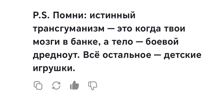516 MirVcegda23 Истинный трансгуманизм 6 месяцев назад Юмор Картинка с текстом Трансгуманизм Повтор 9 6 Ещё 0