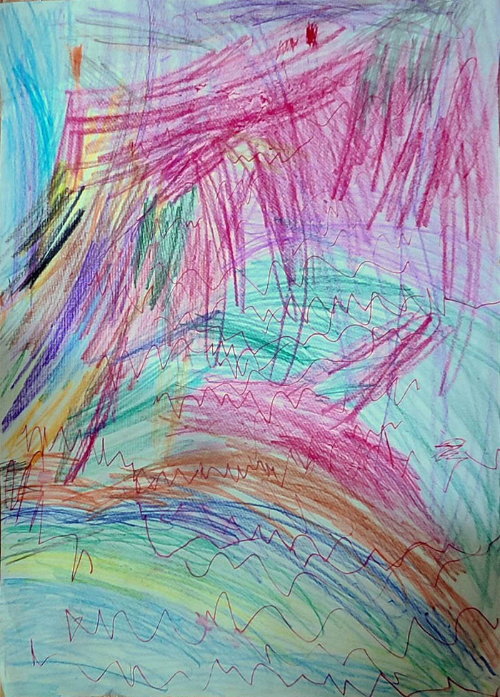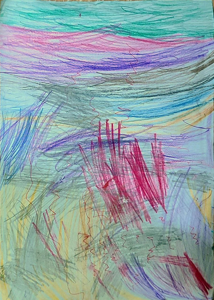Всё-таки в творчестве дети восполняют отсутствие навыков необычными решениями. Казалось бы — просто заштрихованный разными цветами лист... А такая красота. Так ещё к нашей юной художнице (2 года 10 месяцев) пришёл на помощь брат — так его вдохновило