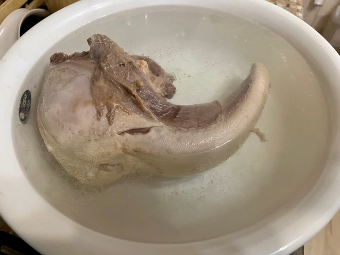 Замачиваем на ночь в соленой воде, дабы вытянуть все плохое и оставить все хорошее. На утро вода покраснела, т.е. соль вытянула остатки сукровицы и чуть просолило мясо.