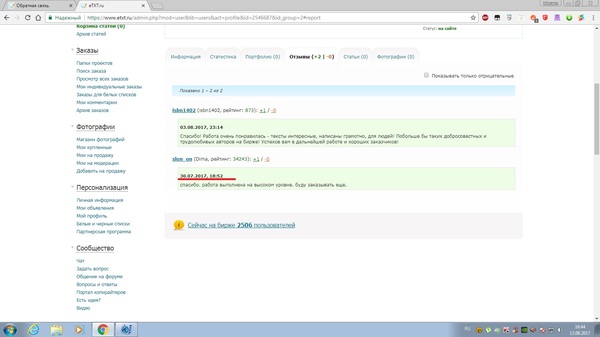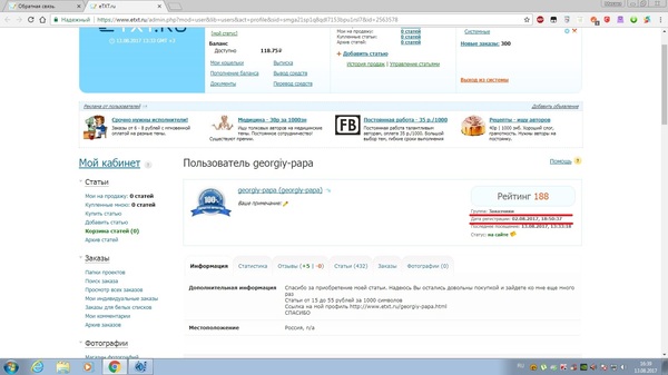 Ниже приведу скриншоты переписки с админом и того пользователя, который якобы сам написал статьи. По скрину видно, что работу я выполнил 30 июля. А тот пользователь, который кинул на меня жалобу зарегистрирован 2 августа. Название статей один в один совпадают с моими. Вот такая не хитрая схема кидалова. Деньги хоть и небольшие, просто жалко потраченного времени на работу. Так что будьте друзья осторожны!