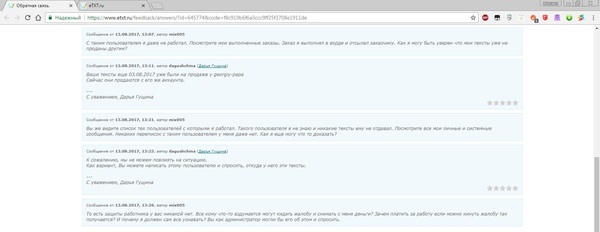Далее опишу свою версию как все происходило. Заказчик получив тексты, регистрируется новым пользователем и выставляет мои работы как свои. Казалось бы, ну и ладно мне не жалко. Но он на этом не останавливается и кидает на меня жалобу. С меня снимают деньги и возвращают ему. Работа выполнена за бесплатно. Администраторы никак не хотят помогать. Пишут сами узнавайте как ваши тексты попали к третьему лицу. Типа я должен был сам контролировать, чтобы тексты никуда не ушли. А как я могу что-то контролировать, если я уже файлы передал заказчику? Вот и доказывай что ты не верблюд.