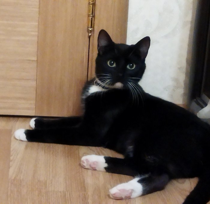 Очень красивая (черная с белой грудкой, белыми лапками и усами), небольшая (2-2,5 кг), гладкошерстная.