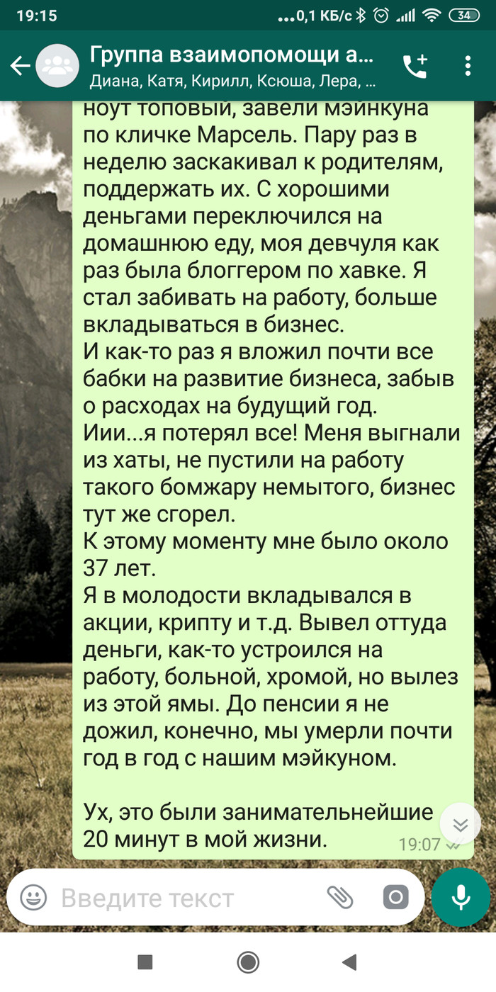 В конце октября, тело исхудавшего кота подобрала в арке Димина соседка с четвертого этажа и похоронила на пустыре за школьным стадионом. Может там на небесах Дима и встретится со своим усато-полосатым другом.