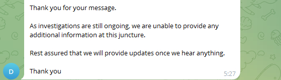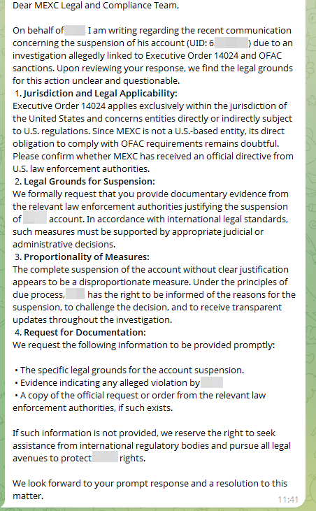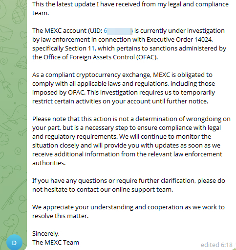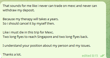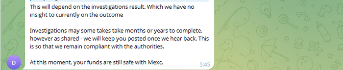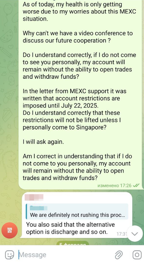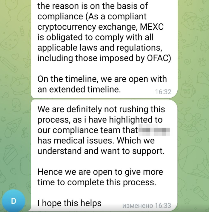 Так как у него есть персональный менеджер, он решил создать чат в телеграмме для решения вопроса, где будем я и он, и представитель Mexc.