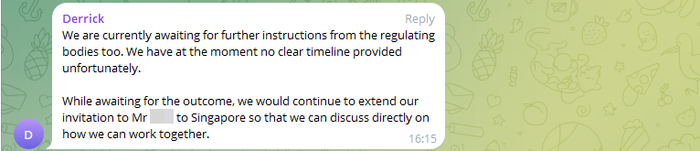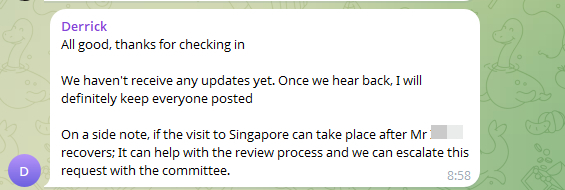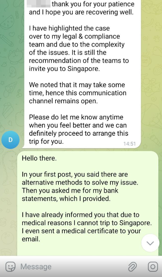 Я съездил на приём ко врачу. Рассказал о том, что планирую слетать в Сингапур, но мне категорически не рекомендовали. Выписали справку, которую я в этот же день отправил на личную почту Derrick`a.