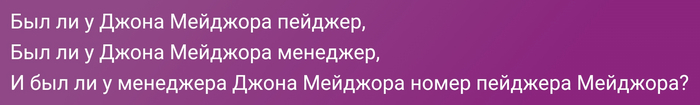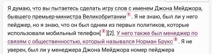 Я думаю, что вы пытаетесь сделать игру слов с именем Джона Мейджора, бывшего премьер-министра Великобритании. Я не знаю, был ли у него пейджер, но я знаю, что он был одним из первых политиков, которые использовали мобильный телефон. У него также был менеджер по связям с общественностью, который назывался Норман Брукс. Я не уверен, был ли у менеджера Джона Мейджора номер пейджера Мейджора, но я думаю, что это маловероятно, так как они могли связываться друг с другом по телефону.