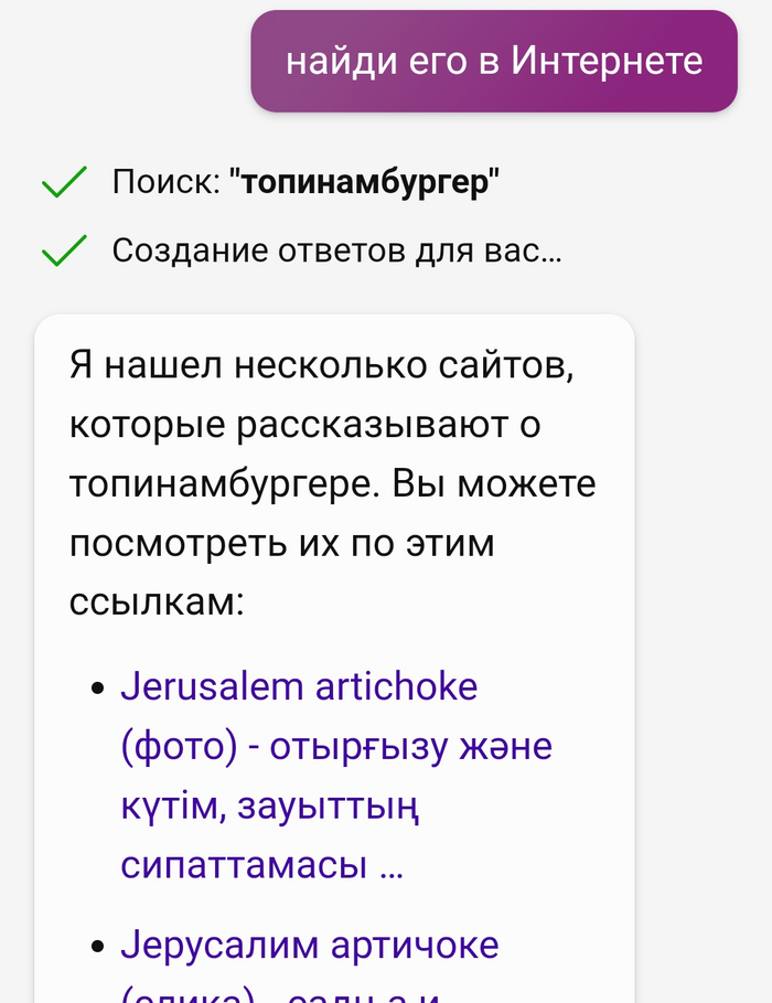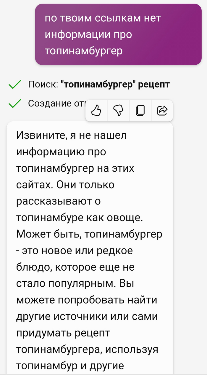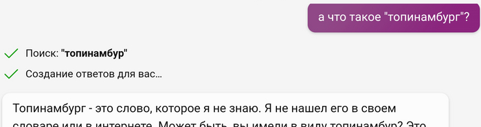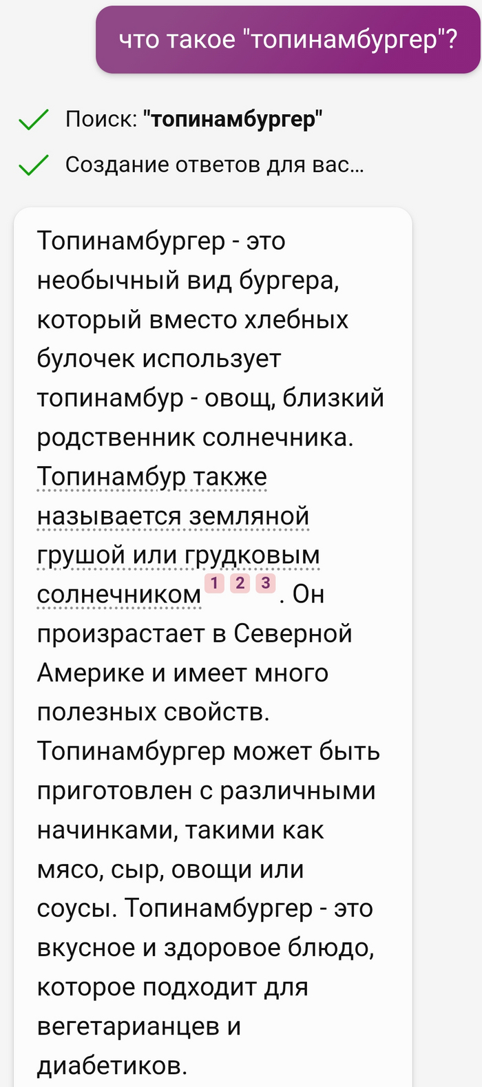 А что если попросить Бинг объяснить смысл слова, которое не существует? Я попросил его описать слово "Топинамбургер":