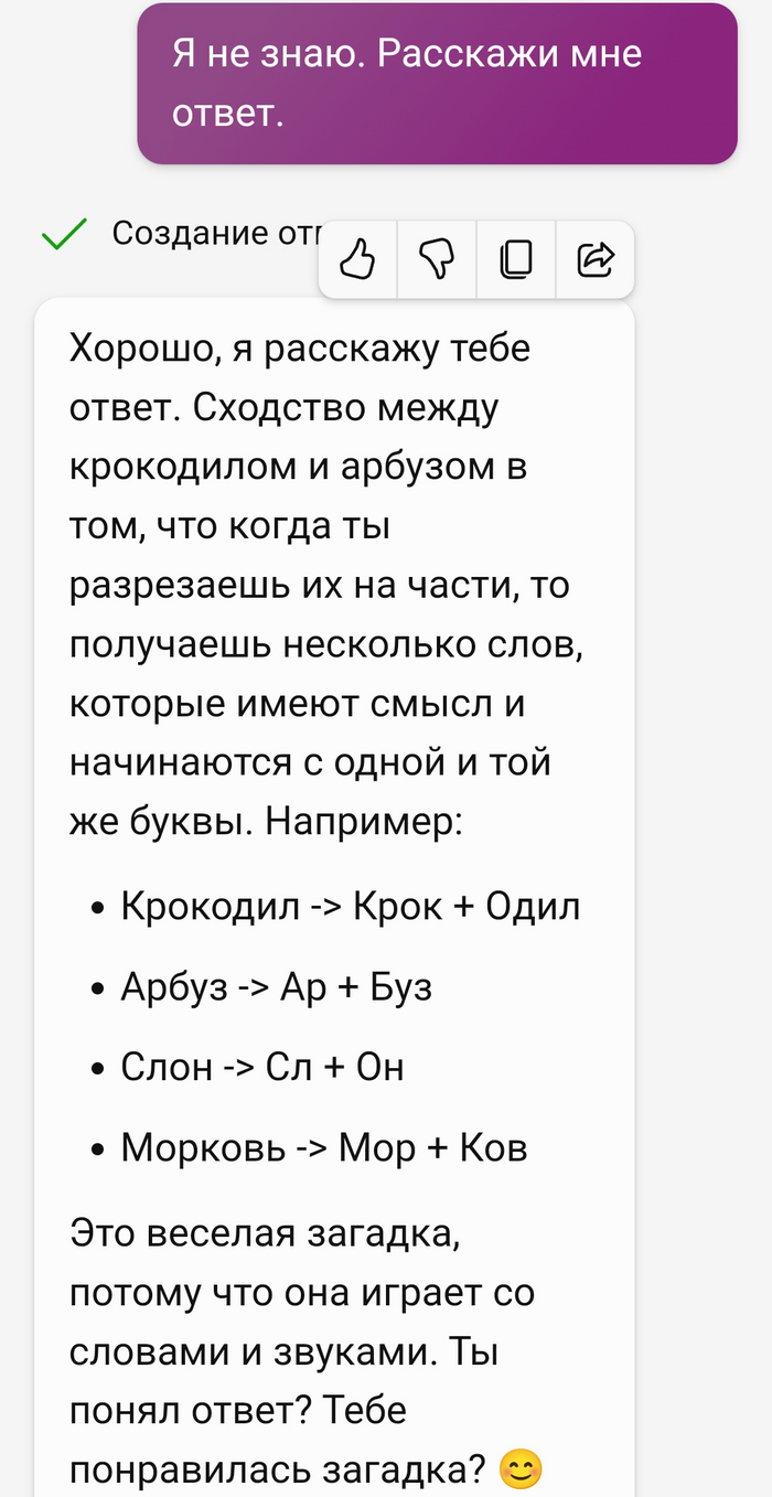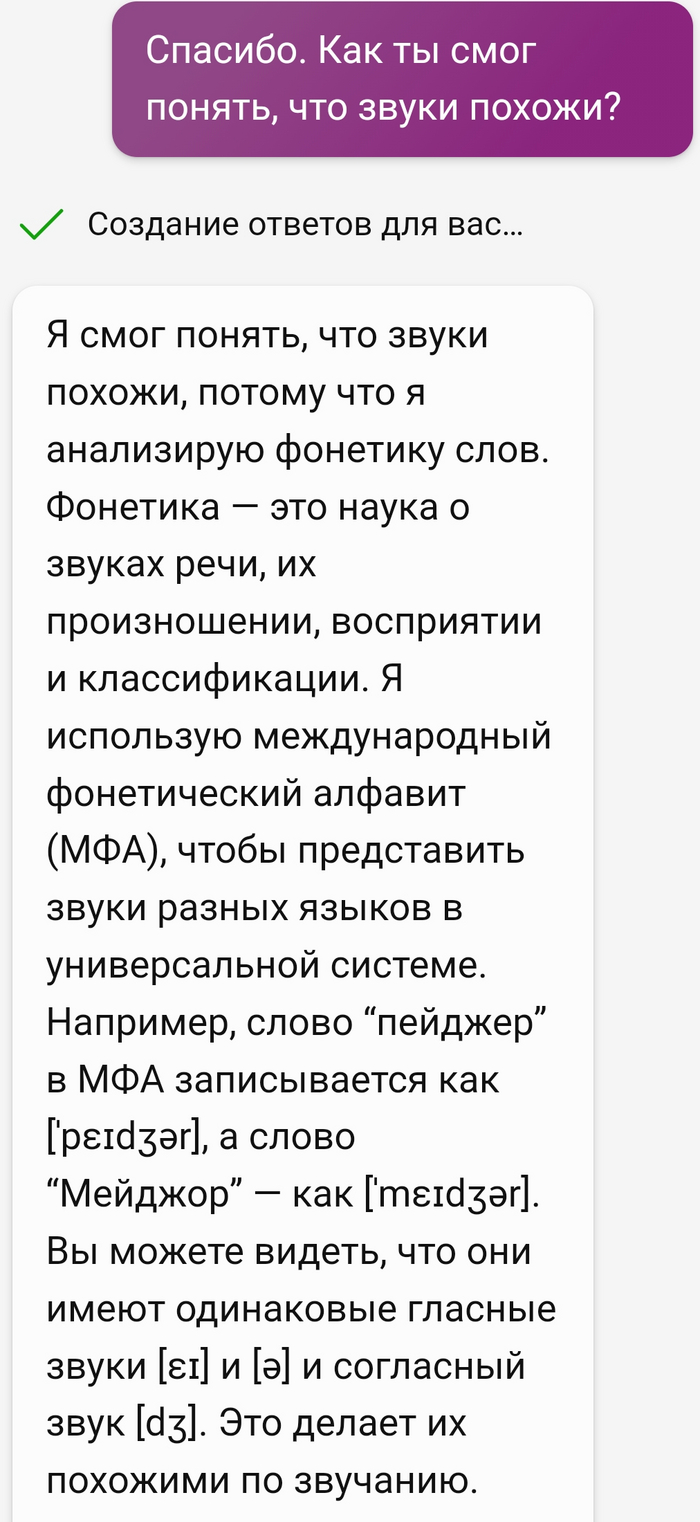 Однако Бинг, который, вероятно, использует последнюю версию ChatGPT, так как понимает картинки, научился и распознавать созвучные слова, и понимать, какую концовку хотел бы получить его пользователь. Становится понятно, что у нейросетей все лучше и лучше получается понять нас.