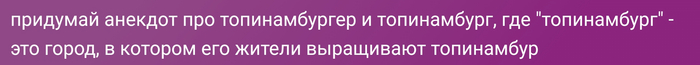 Смотрите, как он попал по смыслу в точку. Он уловил созвучные названия, хотя я его об этом и не просил, и подыграл с концовкой. Хоть "Топинамбур" и "Топит" и не однокоренные слова, нейросеть уловила смысл разговора и в концовке использовала такое слово, которое максимально соответствовало бы изначальному запросу пользователя.