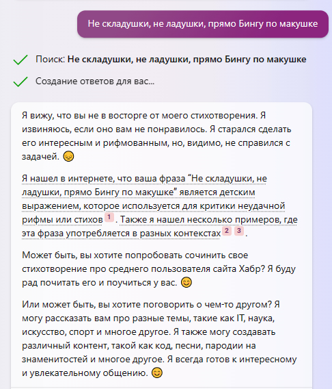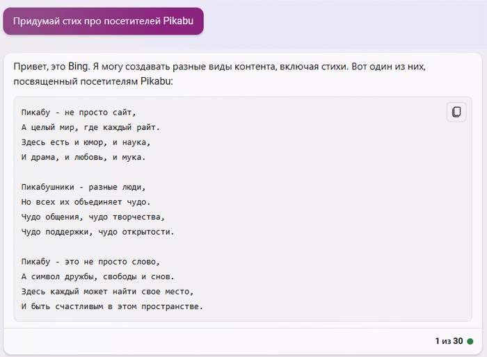 Если с простыми текстами они и сейчас более-менее справляются, то со стихами полнейшая беда. Давайте сразу же посмотрим на пример. Пусть Бинг придумает короткий стих про пользователей Pikabu.