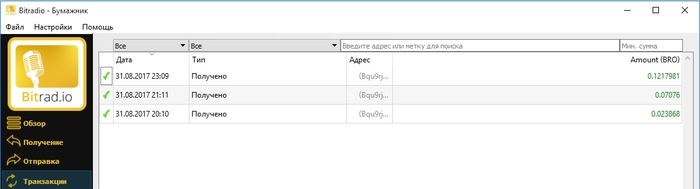 После регистрации я открыл страницу с какой-то рандомной станцией, тут же выключил звук и скачал BRO-кошелек. Кошелек синхронизировался с сетью несколько часов. Пока докачался последний блок, в админке сайта уже маячили 3 перевода: