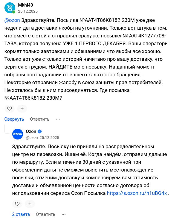 @Ozon, Посылка №AAT4T86K8182-230M отправлялась вместе с посылкой AAT4K1277708-TA8A. Как ни странно вторая посылка, в которой были ничего не стоящие материально вещи пришла очень быстро, однако первая, в которой находилась дорогостоящая техника, неожиданно пропала на сортировочном центре. При этом ваши операторы на протяжении 2 недель убеждали меня в том что посылка в пути, просто возникли небольшие трудности на маршруте. А теперь из постов других пострадавших выясняется что по истечении срока доставки посылка "отправляется в утиль". Это вы ловко придумали. Я вам ЗАПРЕЩАЮ УТИЛИЗИРОВАТЬ МОЮ ПОСЫЛКУ. И требую принять все меры по ее поиску и дальнейшей доставки до пункта выдачи. И вот вам сборничек статей которые вы нарушаете, помимо вашей любимой 159 УК РФ.