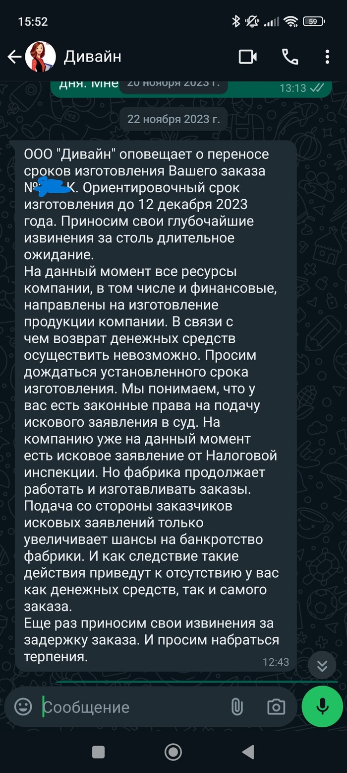 Прошел установленный срок изготовления, а от "Дивайн" тишина, на звонки не отвечают. офис продаж закрыт. Спустя еще какое-то время приходит сообщение: