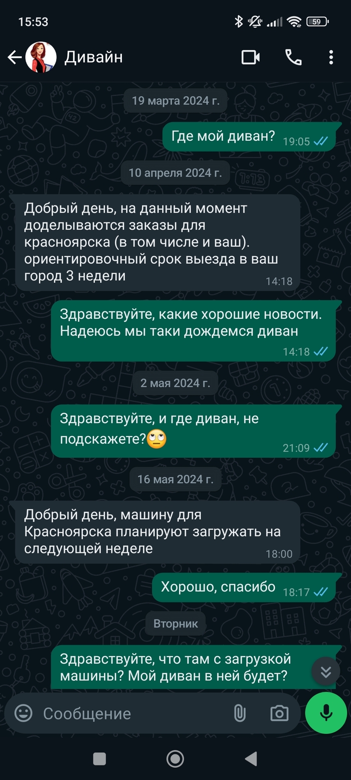 Надежда в груди разгорелась с новой силой. Казалось бы, хеппи энд? Но не тут то было! Сегодня, 23 мая 2024 года мне написали... Что мой диван не влез в машину и придется подождать еще немного!