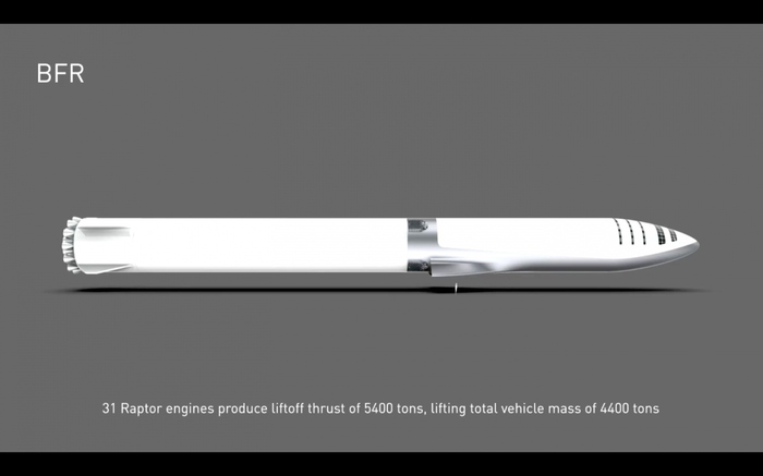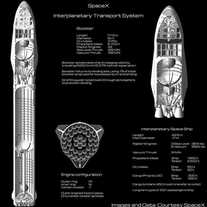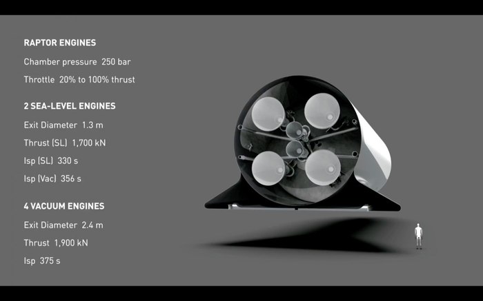 31 раптор? 5400 тонн тяги? ЧТО? где хотя бы те 300 тонн тяги что были в ITS? Тут уже 175 тонн тяги, это в два раза меньше заявленной. Эм, ладно.