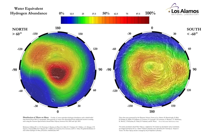 По скромным подсчетам, на поверхности Марса, на глубине не более 1.5 метров залегает почти три миллиона тонн льда, без учета северного полюса, а вот на северном полюсе, оценки прыгают от 6 до 30 миллионов тонн льда, водяного льда.