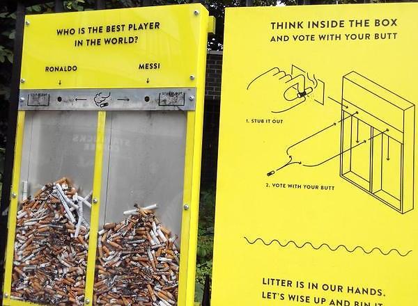 Британская компания "Hubbub", специализирующаяся в охране окружающей среды, пришла к интересному решению, установив на улицах Лондона щиты с прозрачными ячейками для избавления от сигаретных окурков. Во главу щита выведен всё тот же извечный вопрос, а над каждой ячейкой — имя одного из двух наиболее оспариваемых.
