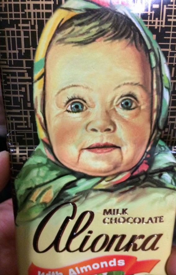 Впоследствие фото было перерисовано художником Н.Масловым с некоторыми изменениями. И с тех пор неизменно смотрит на нас с обертки этого шоколада.