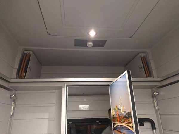 Полка для чемоданов - мой чемодан туда не влез, т.к. там уже был чемодан соседа, поэтому пришлось ставить его за дверь ( дверь должна быть закрыта постоянно)
