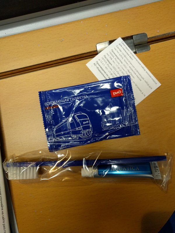 Это набор "путешественника" - щетка (строго одноразовая - если утром использовать, то на вечер надо исказть\просить альтернативу), паста (ну, разбалованные колгейтами и аквафрешами - явно покрутят носом. Сложно оценить действие, т.к. там ничтожное количество + поездка слишком короткая). И освежающая салфетка - тут нечего и добавить.А, весь этот набор хранится между торцом кровати и стенкой (ближе к окну) и заложен между двумя тапочками. Обратно я ехал в купе повышенной комфортности (далее ПК) - отличия минимальные - в купе не 4 койки, а две, но они одна над другой. Т.е. если "верхний" решил поспать, то "нижнему" ничего не остается, как тоже лечь или сгибаться. Опять же, в ПК - кроме набора на фото и тапочек, дали ещё расческу, мыльце, губку для обуви.