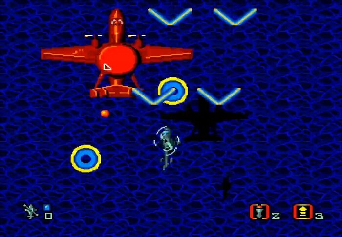Крупногабаритный бомбардировщик, атакует вращающимися кольцами, и отсоединяющимися элементами (крыльями). Можно легко уничтожить, если прижаться к хвосту самолёта, в момент когда бомбардировщик перестает атаковать кольцами и начинает сбрасывать крылья, в этом месте сброшенные крылья игрока не достают.